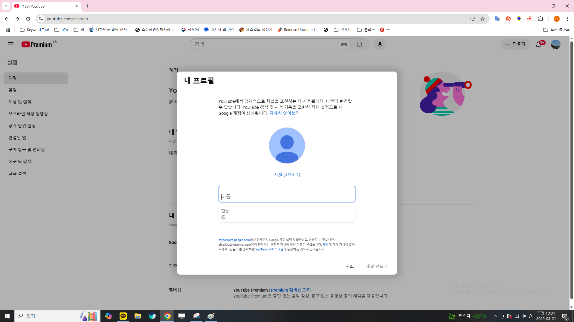 설정 페이지로 이동하면 왼쪽 사이드바에서 '계정' 옵션을 찾아 클릭해 주세요. 그 다음 '내 YouTube 채널' 섹션에서 '채널 추가 또는 관리' 버튼을 클릭해야 해요.